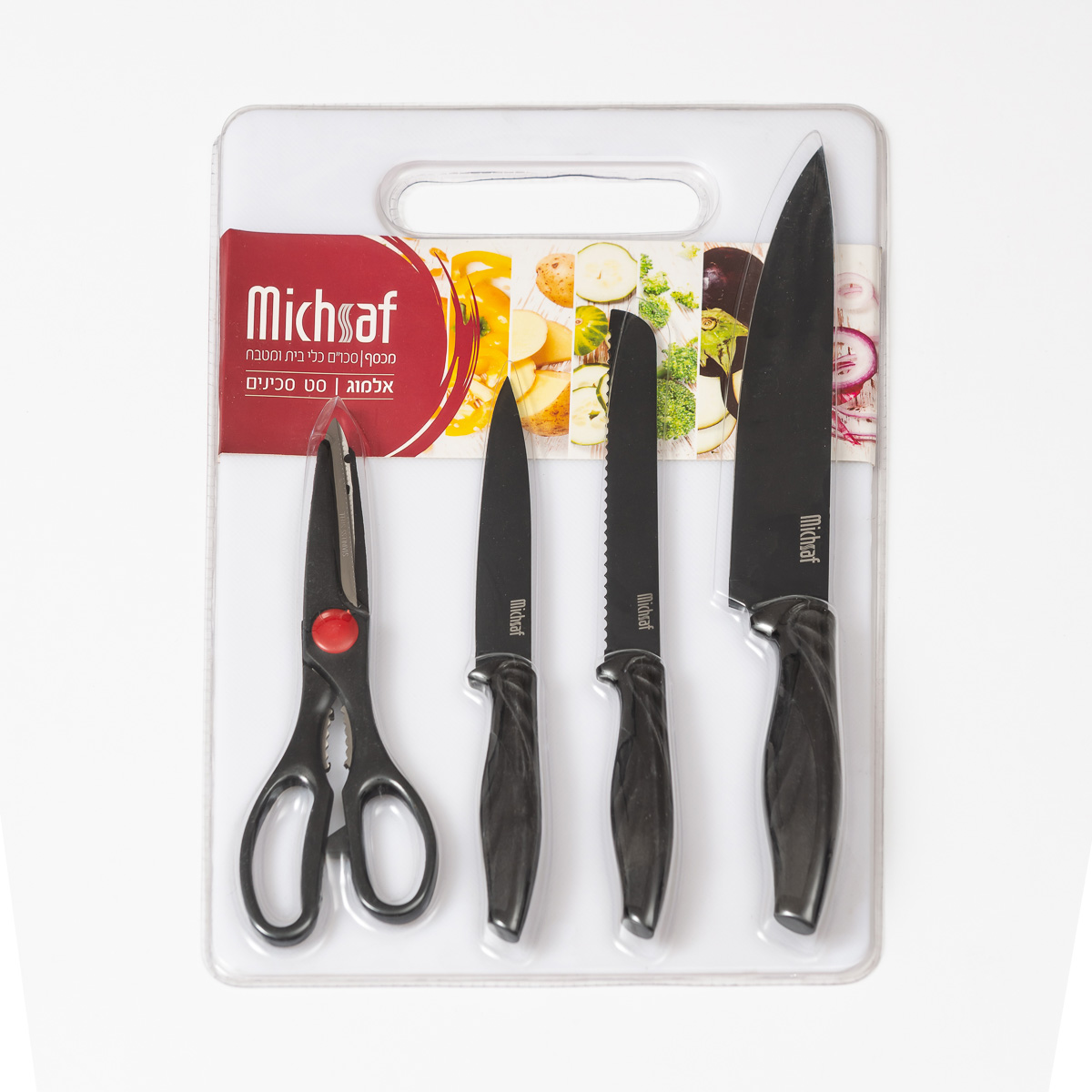 סכין שף אורך להב 20 ס"מ סכין לחם משוננת אורך להב 15 ס"מ סכין רב שימושית אורך להב 13 ס"מ מספריים רב שימושיות קרש חיתוך מפלסטיק בגודל 36*25 ס"מ