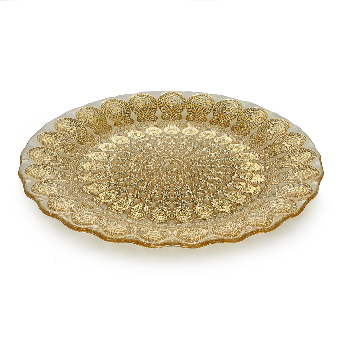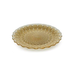 צלחת זכוכית בגוון זהב עם עיטורים עדינים למראה יוקרתי שמרשים בכל אירוח. בסדרה זו ניתן לרכוש צלחות במידות נוספות וקערת הגשה אובלית