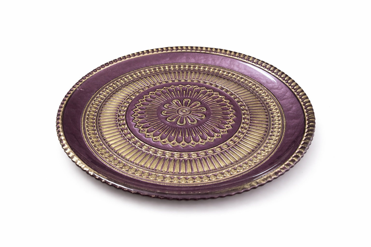 צלחת דקורטיבית בגווני סגול וזהב, בעיצוב אלגנטי עם עיטורים עדינים ומראה יוקרתי.