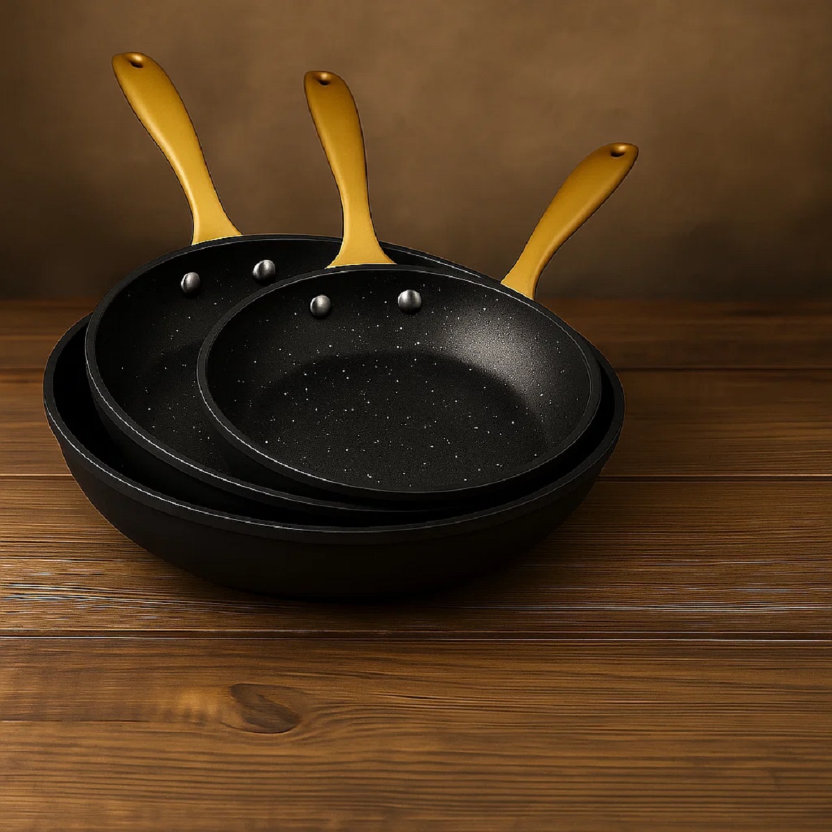 מארז כולל: מחבת 20 ס"מ Black &Gold + מחבת 24 ס"מ Black &Gold + מחבת 28 ס"מ Black &Gold